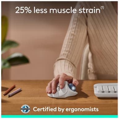 Langaton Logitech Ergo M575S -pallohiiri on ergonomien sertifioima ja vähentää kyynärvarren lihasjännitystä 25 %. Se mahdollistaa työskentelyn mukavuusalueellasi, missä ikinä oletkin. Nyt hiljaisilla napsautuksilla ja mukautettavalla ohjauksella.Tutustu ominaisuuksiin