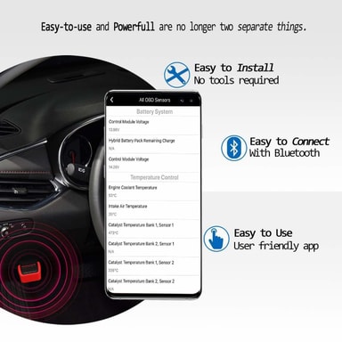 Virhekoodilukijaa on helppo käyttää. Langaton Bluetooth-yhteys tekee diagnostiikkatyökalusta kannettavan ja joustavasti käytettävän.