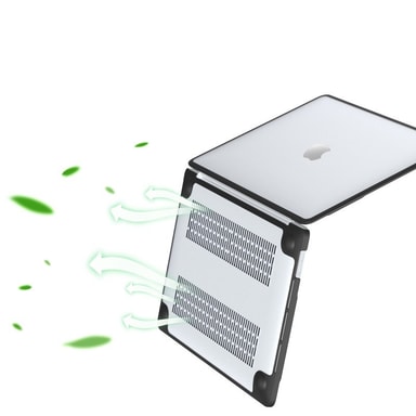 Erinomainen ilmanvaihto: Suojakuoren pohjassa on korotetut kulmat ja ilmanvaihtoaukot, jotka mahdollistavat erinomaisen ilmanvaihdon ja estävät MacBookin ylikuumenemisen. Tämä on erityisen tärkeää pitkäaikaisessa käytössä tai raskaiden ohjelmien suorittamisessa. Korotetut kulmat myös estävät MacBookin pohjan kosketuksen pöytään, mikä vähentää naarmuuntumisen riskiä. Ilmanvaihtoaukot on suunniteltu siten, että ne eivät estä ilmankiertoa, vaan edistävät sitä, jolloin MacBook pysyy viileänä ja toimintakykyisenä pidempään. Tämä suojakuori on ihanteellinen valinta, kun haluat varmistaa MacBookin optimaalisen suorituskyvyn ja pitkän käyttöiän.