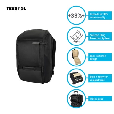 Targus Work+ Expandable 27-32L -repun avulla voit pakata kaikki tärkeimmät tavarasi yhteen tilaan. SafePort Sling -suojajärjestelmän ansiosta kannettavasi pysyy paikallaan, ja vedenpitävien materiaalien ansiosta teknologiasi on suojassa myös säältä.Tutustu ominaisuuksiin