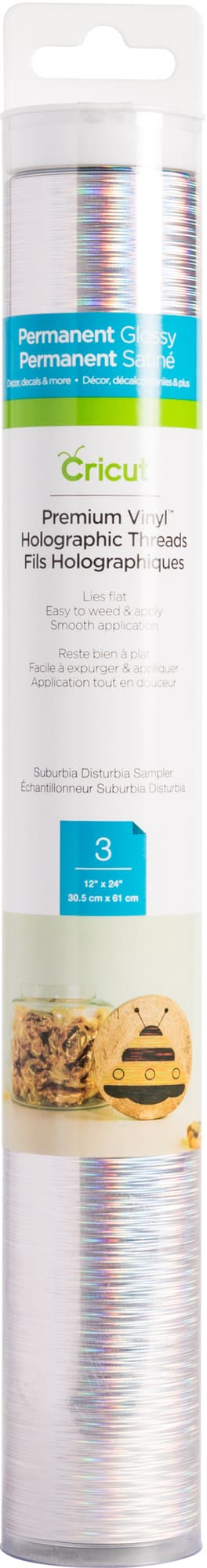 Valmistaudu hämmästymään moniväristen Cricut Premium Permanent Vinyl -hologrammiarkkien ominaisuuksista. Arkki pysyy tasaisena leikkuumatolla, mikä tekee leikkaamisesta, irrottamisesta ja kiinnittämisestä helppoa. Arkit ovat vedenpitäviä. Myyntipakkaukseen sisältyy kolme moniväristä arkkia, joiden koko on 30,5 cm x 61 cm. Väreinä tulppaani, sininen ja kulta. Suositellaan käytettäväksi sisätiloissa ja voidaan käyttää kaikkien Cricut-leikkureiden kanssa.