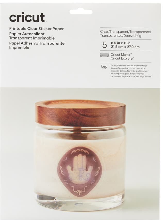 Cricut Print -tarrapaperissa on viisi 21,5 x 28 cm kokoista tarrapaperiarkkia. Voit ladata ne mustesuihkutulostimeesi ja antaa niiden jäähtyä, jonka jälkeen voit laittaa ne Cricut Joy -leikkuukoneeseen ja valita Design Space -ohjelmassa vaihtoehdon "Printable Sticker Paper (clear)", jolloin voit leikata vain tarran, etkä sen alla olevaa taustapaperia. Piristä kotiasi ja asusteitasi näillä upeilla tarroilla.