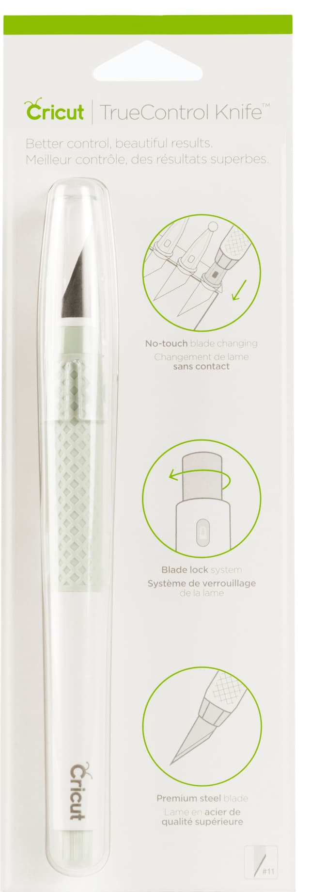Cricut TrueControl -veitsen avulla saat paremman hallinnan ja kauniin lopputuloksen joka kerta. Se tarjoaa huipputerävän reunan, lävistävän kärjen, laadukkaan terälukitusjärjestelmän ja hands-free-terävaihtojärjestelmän, jonka ansiosta terää ei koskaan tarvitse koskea suoraan. Veitsi leikkaa monenlaisia materiaaleja, kuten paperi, kartonki, ohuet muovitsekä kangas ja tarjoaa erinomaisen tarkkuuden. Vaihtoterät myydään erikseen.