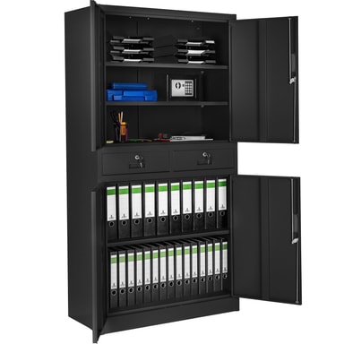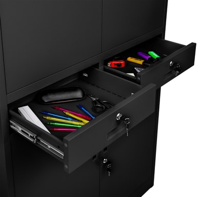 Kohokohdat • Lukittava metallinen arkistokaappi, jossa 2 laatikkoa • korkeussäädettävät hyllyt • 2 kaappilokeroa, joissa 2 tai 3 hyllyä • helppo kokoonpano - erittäin vakaa • laadukas pulverimaalattu teräs • vahvistetut saranaovet (avautumiskulma: 130°) ääntä vaimentavilla kumipuskureilla • helppo siivota sisätilat litteiden hyllyjen ansiosta • varustettu turvallisella sylinterilukolla kahdella avaimella • Färg: musta/musta