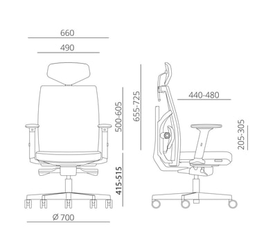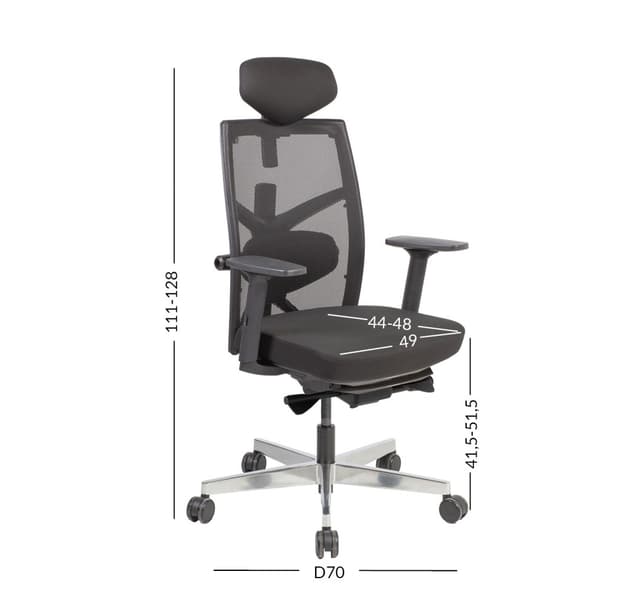 Työtuoli TUNE 70x70xH111-128cm, istuin: kangas, selkänoja: verkkokangas, väri: musta. Pintamateriaali: polyesterikangas, 50 000 Martindale’, selkänoja: polyesteriverkkokangas. Musta muovirunko. Mekanismi ja säädöt: synkronimekanismi, lukittavissa useaan asentoon, automaattinen keinun jäykkyksen hallinta. Selkänojan korkeus 50-60,5cm. Säädettävä lantiotuki. Istuimen syvyys säädettävä 44-48cm, istuimen korkeus säädettävä kaasujousella. Mustanväriset muoviset käsinojat säädettävinä kolmeen suuntaan. Käsinojien korkeus säädettävä 20,5-30,5cm, käsinojien tukipintaa saa työntää eteen-taakse ja muuttaa kääntökulmaa sisään-ulos. Niskatuki kallistettavissa 30°, niskatuen korkeus on säädettävä. Alumiini 5-haarainen jalkaristikko D70cm, 65mm lattiaa säästävät pyörät jarruilla. Mitat: korkeus 111-128cm, istuimen korkeus 41,5-51,5cm, istuimen syvyys 44-48cm, istuimen leveys 49cm. Painoraja 120kg.