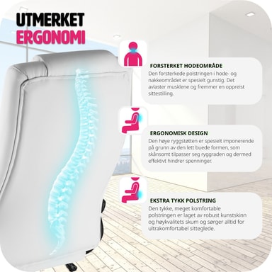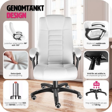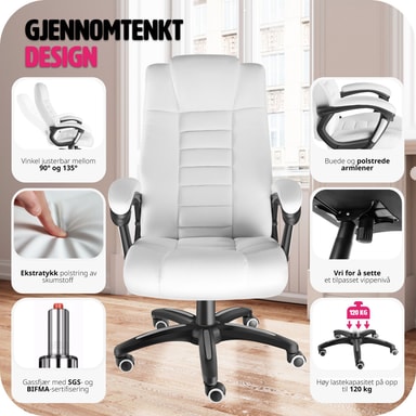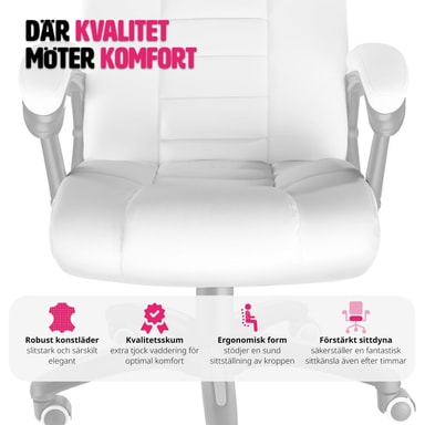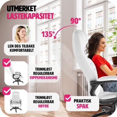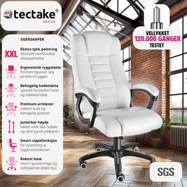 Tämä tectaken toimistotuoli sopii saumattomasti jo olemassa olevien kalusteiden rinnalle ja luo mukavan työympäristön. Kääntyvässä tuolissa on erittäin paksu pehmuste (jopa 12 cm) pehmeää ja mukavaa istumista varten. Tämän tuolin pehmusteiden korkea laatu ja tiheys takaavat pitkän käyttöiän. Tuolin ergonomisesti muotoillun istuin- ja selkänojan sekä vahvistetun ja pehmustetun niskatuen ansiosta saavutetaan optimaalinen istumamukavuus. Toimistotuolissa on saumaton korkeudensäätö, mikä tarkoittaa, että se voidaan säätää täydellisesti vartalosi koon ja työpöydän pinnan mukaan. Tuolin turvallisuustähden muotoinen jalusta tarjoaa suuren vakauden 5 kaksoispyörän varassa. Toimistotuolissa on saumattomasti säädettävä kallistusmekanismi, joka voidaan säätää kehon painon mukaan. Olipa kyseessä kotitoimisto, työpaikka tai pelihuone, tämä tectaken ylellinen toimistotuoli tarjoaa sinulle mukavan paikan tehtävien suorittamiseen.