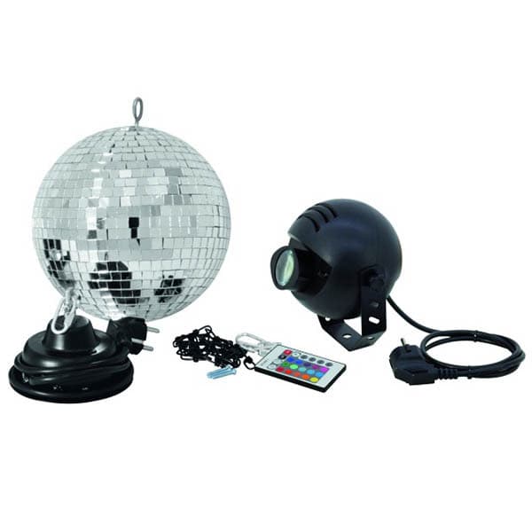 Täydellinen peilipallosetti 20 cm peilipallolla Sarjan mukana tulee LED-spottivalo, jossa on eri värejä, joita voit vaihtaa mukana tulevalla kaukosäätimellä. Spotin ja kaukosäätimen lisäksi mukana on myös moottori, johon voit ripustaa peilipallon.