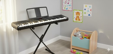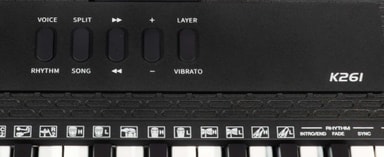 Selkeä LED-näyttö tekee navigoinnista helppoa, ja koskettimistossa on USB MIDI -liitäntä musiikkiohjelmistojen käyttöä varten. Pakkauksessa on myös virtalähde ja nuottiteline. Lisäjoustavuutta varten E261 toimii kuudella AA-paristolla (eivät sisälly toimitukseen), ja siinä on tulo sustain-pedaalille (myydään erikseen).