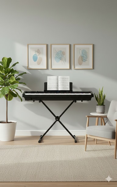 Tämä paketti sisältää tukevan kosketinsoitintelineen ja pedaaliyksikön, jossa on kolme pedaalia, joten saat täyden pianokokemuksen ensimmäisestä päivästä lähtien.