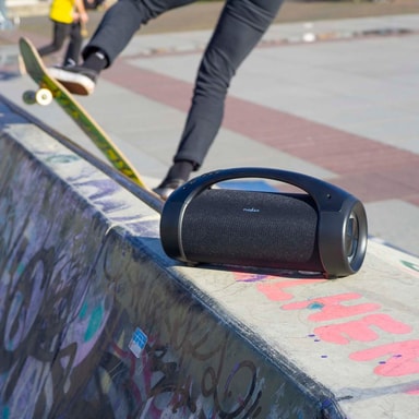 IPX5-suojausluokituksen ansiosta tämä langaton boombox-kaiutin sopii erinomaisesti myös ulkotiloihin, kuten rannalle, allasbileisiin, vesille tai veneeseen. Integroidut väriä vaihtavat RGB LED -valot kruunaavat bileet, mutta ne voi tarvittaessa myös poistaa käytöstä. Sisäänrakennettu akku pitää juhlat käynnissä jopa 6 tuntia yhdellä latauksella. Akku latautuu USB Type-C™ -liitännän kautta vain 3,5 tunnissa.