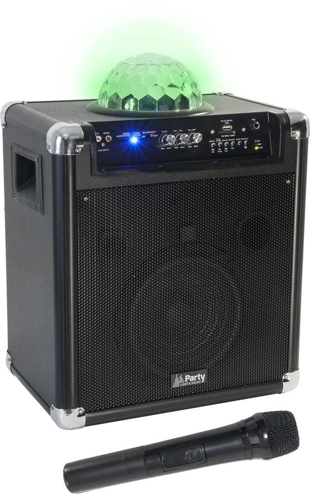 Portable, battery – or mains powered speaker box with built-in amplifier and wireless vhf mic combined to an rgb light effect for mobile and karaoke use. usb, micro sd & bluetooth inputs. 1x mic input with priority function. 1x wireless vhf mic. 1x aux input. fm tuner with pre-set stations. lcd display. rec function. eq. recessed side-mounted handles. remote control & leads included.