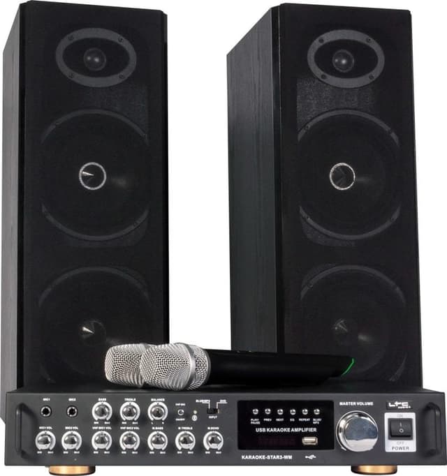 Täydellinen helppokäyttöinen karaokesettiSetissä mukana: Karaoke vahvistin, johon kuuluu 2-teiset kaiuttimet, sekä langattomat mikrofonitTulot: 2 x MIC, USB, BLUETOOTH & LINEÄäniefektit ja säädöt: Mikki, kaiku, basso, ...