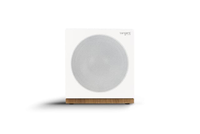 Kaunis Tangentin subwoofer mattasatiini maalilla ja pähkinäpintaisella sokkelilla. 8 ""bassokaiutin i edessä ja paljon kytkentämahdollisuuksia takana. Subwoofer tarjoaa tietysti useita asetuksia 90 watin sisäänrakennetulle vahvistimelle.