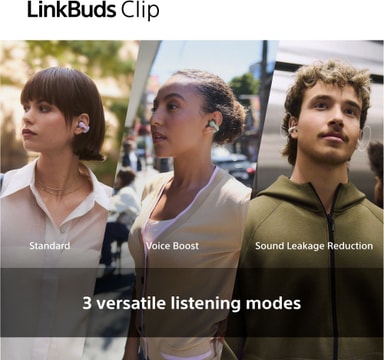 Täysin langattomat Sony LinkBuds Clip -open-ear-kuulokkeet tarjoavat upean äänenlaadun ja maksimaalisen mukavuuden samassa paketissa. Digital Sound Enhancement Engine parantaa ääntäsi parhaaksi mahdolliseksi, kun taas 10-alueinen taajuuskorjain ja erikoiskuuntelutilat mahdollistavat kokemuksen räätälöinnin tarpeidesi mukaan. Kuuntele pidempiä aikoja 37 tunnin akun ansiosta ja nauti kevyen ja ergonomisen muotoilun mukavuudesta.