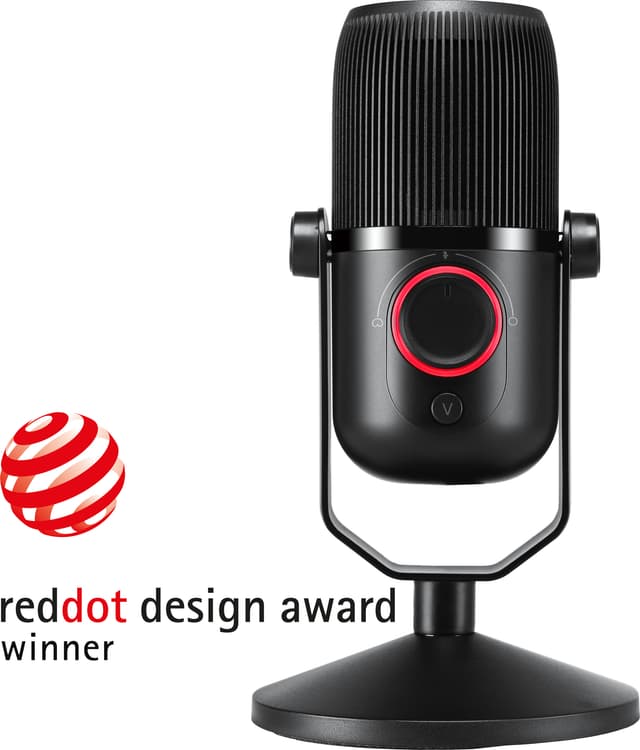 Ohjaus: Säädä mikrofonin vahvistusta ja valitse äänitystila helposti etuosan nupin avulla. Äänenvoimakkuuden säätö on sijoitettu heti tämän nupin alapuolelle. Mikrofoni voidaan myös vaientaa kokonaan.