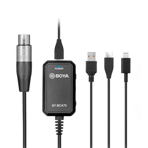 BOYA BY-BCA70 är en professionell XLR-ljudadapter som är speciellt utformad för att öka den praktiska flexibiliteten hos din XLR-mikrofon till de flesta mobila enheter. BY-BCA70 levereras med tre utbytbara ljudkablar: USB Type-C, Lightning och USB-A, vilket gör det möjligt för alla XLR-mikrofoner att vara kompatibla med PC, Andorid / iOS-smartphones, surfplattor etc, perfekt för inspelning i hemmastudio, podcast, sång & instrument soloinspelning, ENG, intervjuer och mer.