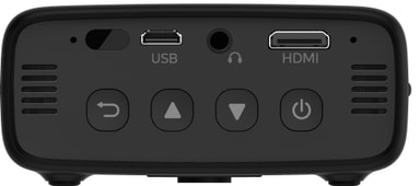 Voit jakaa videoita, kuvia ja äänitiedostoja Mini HDMI -portin kautta. Voit samalla ladata projektorin akkua erillisen USB-kaapelin avulla.