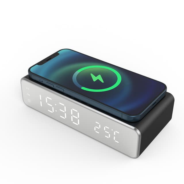 • Digitaalinen LED herätyskello langattomalla laturilla/lämpömittarilla Musta/hopea