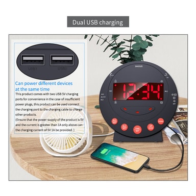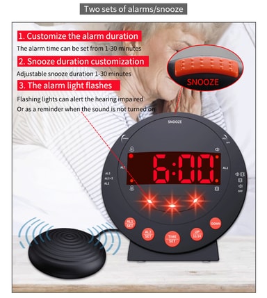 Vaikeuksia nousta sängystä? Sitten tämä herätyskello on ratkaisu! Siinä on monia ominaisuuksia, jotka saavat kenet tahansa nousemaan ylös: tärinäravistin, joka ravistaa tyynyä, sekä 2 herätysasetusta ja suuri torkkupainike (1-30 minuuttia). Kirkkautta ja äänenvoimakkuutta voidaan säätää - nosta maksimiin, jotta pääset helpommin alkuun.
