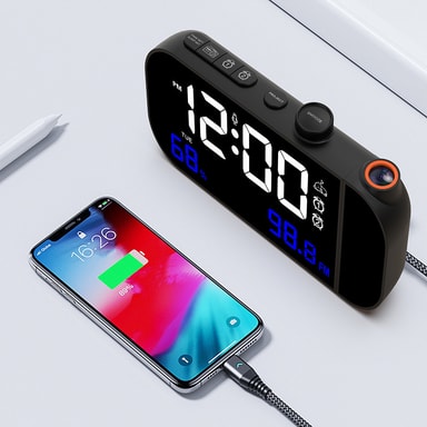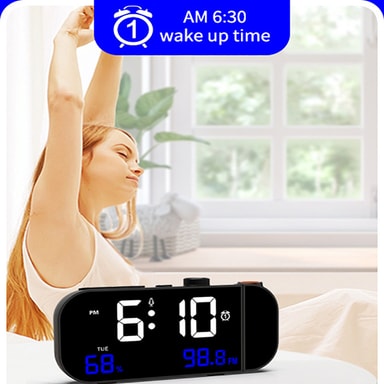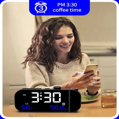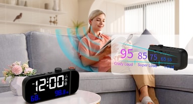 Kätevä käyttöliittymä: Kellossa on selkeä ja intuitiivinen käyttöliittymä, jossa on helppokäyttöisiä painikkeita hälytyksiä, äänenvoimakkuuden säätämistä ja valikoissa liikkumista varten. Suuri LED-näyttö näyttää kellonajan, päivämäärän, lämpötilan ja hälytyksen tilan yhdellä silmäyksellä.