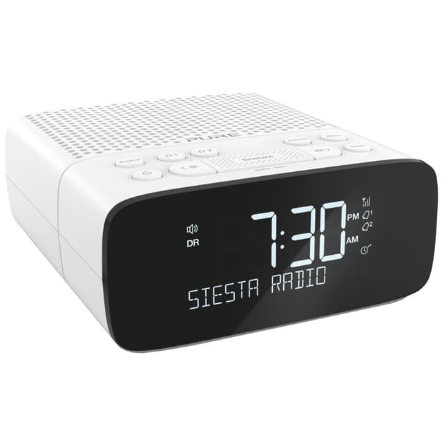 Herää aamuisin miellyttävällä tavalla. Pure Siesta S2 -kelloradio toistaa lähetykset FM- ja DAB-radiokanavilta kirkkaalla äänenlaadulla. Radiossa on selkeä digitaalinen näyttö ja kätevät painikkeet, joiden avulla hallitset äänenvoimakkuutta tai aktivoit torkkutoiminnon.