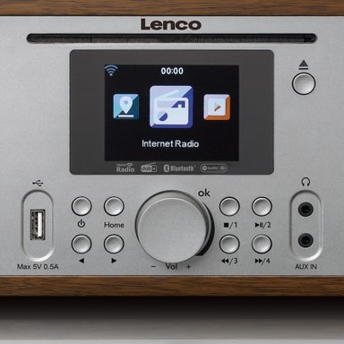 Lenco DIR-270 Internet Radio (puu) Kuuntele suosikkiradioasemiasi Lenzon DIR-270-internetradiolla - tässä tyylikkäässä puun ja hopean värisessä muotoilussa. LCD-värinäyttö Hälytys, uniajastin ja torkkutoiminto Lähtö: 2 x 10W (RMS) Sisältää EQ:n Liitännät: Aux, kuulokelähtö ja USB Mukana kaukosäädin ja verkkolaite