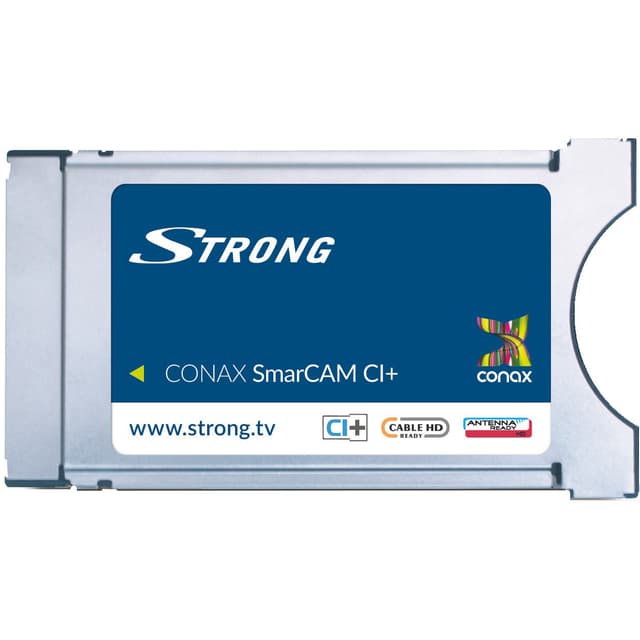 Strong Conax SmartCAM Ci+/CA-moduuli maksu-TV-korteille Conax-signaalin vastaanottoon. Yhdeensopiva antenni- ja kaapeliverkon (DVB-T/C, MPEG4/DVB-T2) -digivirittimien kanssa.