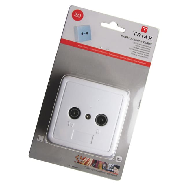 Kannellinen Triax-antennipistorasia läpisyötöllä televisio, radio ja satelliittivastaanottimille. Ulosmenoportit radiolle ja TV:lle.