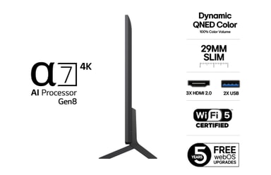 QNED80-televisiossa yhdistyy α7 AI Processor 4K Gen8 -prosessorin teho ja QNED evo -väriteknologia, mikä takaa eloisat ja tarkat värit sekä erinomaisen kontrastin. Edistynyt Local Dimming -toiminto ja HDR10 Pro parantavat jokaista kohtausta. 29 mm ohuen muotoilun ja joustavien jalustavaihtoehtojen ansiosta se sopii täydellisesti mihin tahansa tilaan. Upea kuva. Upea suorituskyky. Upea yhteensopivuus.