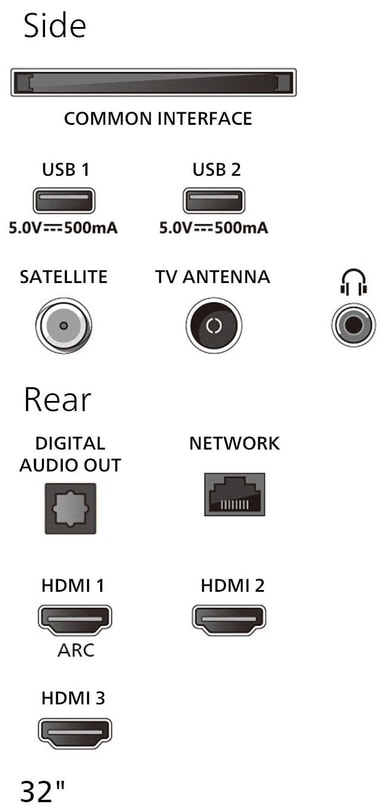 Televisiossa on 3 HDMI-porttia, 2 USB-porttia ja Ethernet-portti. Lisäksi mukana on wifi ja Bluetooth langatonta suoratoistoa varten, satelliitti-/antenniliitin sekä digitaalinen äänilähtö ulkoiselle äänelle.