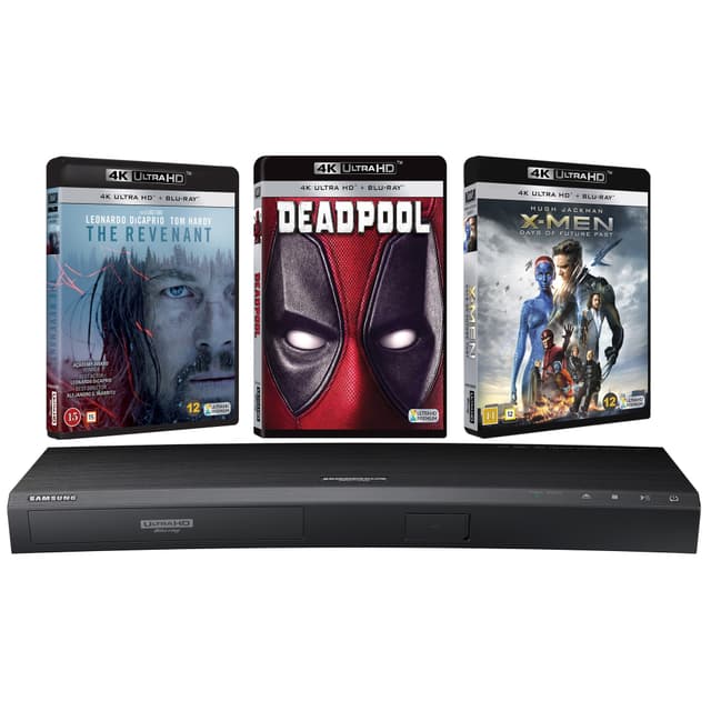 Samsung Ultra HD Blu-ray-soittimessa on kaareva muotoilu, joka sopii täydellisesti Samsung Curved 4K UHD -television rinnalle. Monipuolinen soitin on taaksepäin yhteensopiva vanhempien levyformaattien kanssa, joten sillä voidaan toistaa Blu-ray-levyjen lisäksi myös DVD- ja CD-levyjä. Saat Blu-ray-soittimen lisäksi kolme 4K UHD -elokuvaa: The Revenant, Deadpool, X-Men.