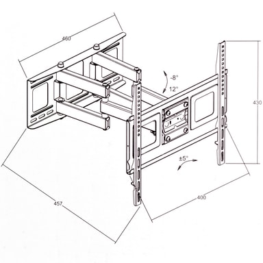 Tekniset tiedot • soveltuu reikävälille: korkeus 5-40 cm, leveys 5-40 cm • seinäetäisyys säädettävissä 7 cm:stä 45,7 cm:iin • kallistettavissa -8°-12° • materiaali: teräs • kuormitettavuus 100 kg:iin asti • • seinäkiinnikkeen paino: noin 6 kg