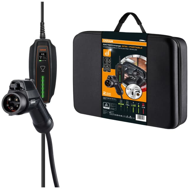 Osram-latauskaapeli sähköautoille on yhteensopiva täysin sähköisten ja hybridiautojen kanssa. Se välittää 3,6 kW/16A lataustehon jopa viiden metrin päähän. Kaapeli on IP65- ja IK10-kestävyysluokiteltu ja säilyy kätevässä säilytyskotelossa.Tutustu ominaisuuksiin