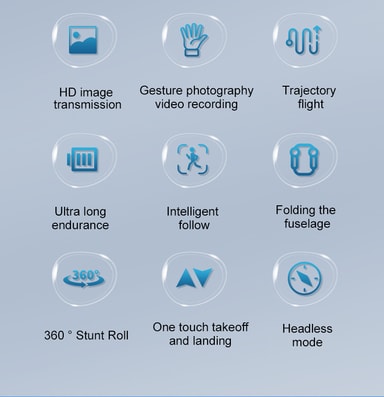 Lisää toimintoja: Nouse/lasku, käänny vasemmalle/oikealle, eteen/taakse, lentää vasemmalle ja oikealle, 3D rollover, rullan muunnos, headless-tila, WiFi-kameran tallennus/valokuvaus/optinen virtauspaikannus kahdella kameralla/5G-kuvansiirto