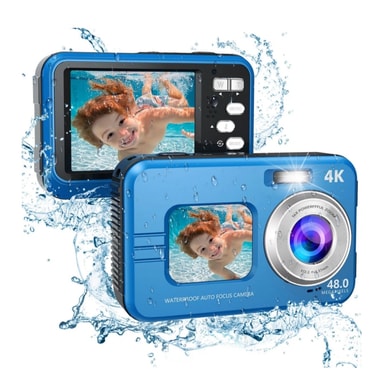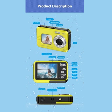 3,5 m/11 FT vedenalainen kamera: Vedenpitävä rakenne mahdollistaa tämän vedenalaisen kameran sukeltamisen 3,5 metriin (11 jalkaa) veden alle. Se sopii täydellisesti snorklaukseen, vesipuistoihin tai muihin vesiseikkailuihin, mukaan lukien uinti, ajelehtiminen, surffaus, ranta ja uiminen (Huomaa: Varmista, että paristoluukku on lukittu tiukasti ennen kuin kamera viedään veden alle.)