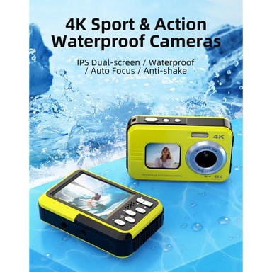 Kaksi näyttöä: Vedenalaisessa kamerassa on 2 näyttöä selfien ottamista varten. Etuosan 1,7 tuuman HD-näyttö helpottaa omakuvien ottamista, ja takana olevan 2,8 tuuman HD-näytön avulla voit tarkkailla kohdetta selkeämmin kuvauksen aikana.