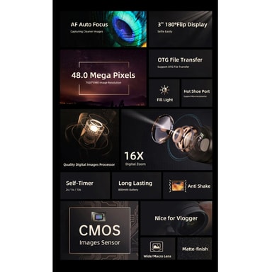 Ota teräviä kuvia 48 megapikselin resoluutiolla ja tallenna upeita videoita Full HD -laadulla tällä helppokäyttöisellä digitaalikameralla. Useita älykkäitä ominaisuuksia, kuten 16x zoom, kasvojentunnistus jne.Tutustu ominaisuuksiin