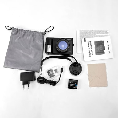 Digikamera 48 MP, HD 1080p, 16x zoom, läppänäyttö, 32 Gt:n musta kortti