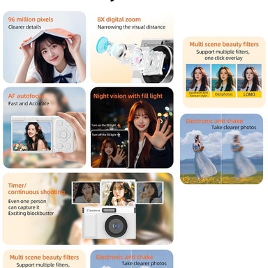 Kannettava ja hauska: Ota tämä kompakti ja kevyt digitaalikamera mukaasi minne tahansa, taskuystävällisen koon ja retro-muotoilun ansiosta. 2,4 tuuman LCD-näyttö helpottaa otosten rajaamista sekä valokuvien ja videoiden tarkastelua. Sisäänrakennettujen pelien ansiosta tämä kamera tarjoaa viihdettä tien päällä. Kamera tukee 13 kieltä, mikä tekee siitä kaikkien käyttäjien saatavilla. Pitkäkestoinen akku tarjoaa jopa 180 minuuttia jatkuvaa käyttöä, mikä varmistaa, että et koskaan menetä hetkeä. Tämä digitaalikamera on täydellinen kumppani matkoille, juhliin ja jokapäiväisiin seikkailuihin, tarjoten hauskan ja kätevän tavan tallentaa ja jakaa kokemuksiasi.