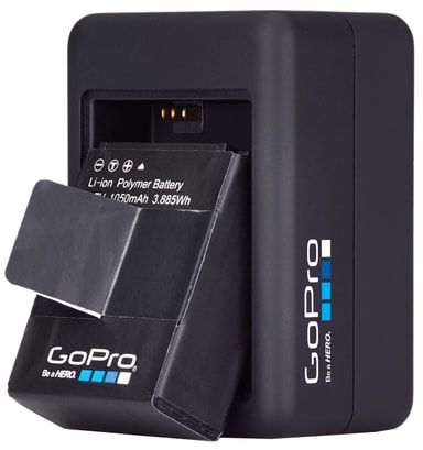 GoPro kahden akun laturilla lataat kaksi GoPro actionkameran Li-ion -akkua samanaikaisesti. Kummallekkin akulle on oma LED-valo, joka ilmaisee latauksen tilan.