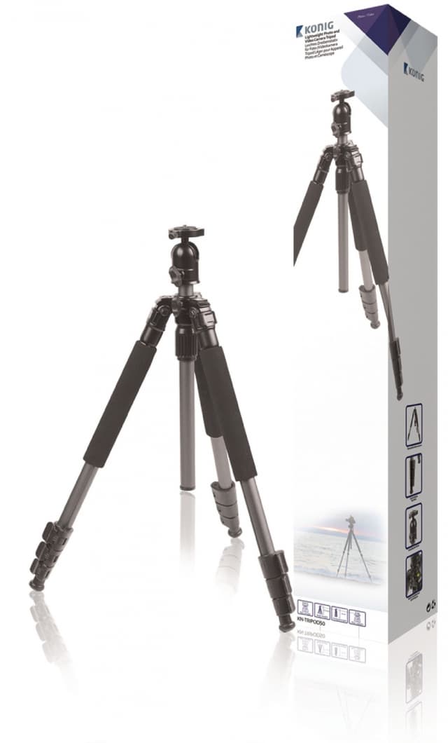 Product description: tripod for photo and video cameras to shoot razor-sharp, stable images. The tripod features many adjustable settings, such as 4-level extendable legs, to create the best angle under every circumstance. features: reversible centre column for taking low-angle shots and ground-level shooting. 4-level extendable legs to adjust the tripod in height. quick-release leg locks to easily secure the height. ball head to move the camera in every direction. carrying case for convenient transportation.