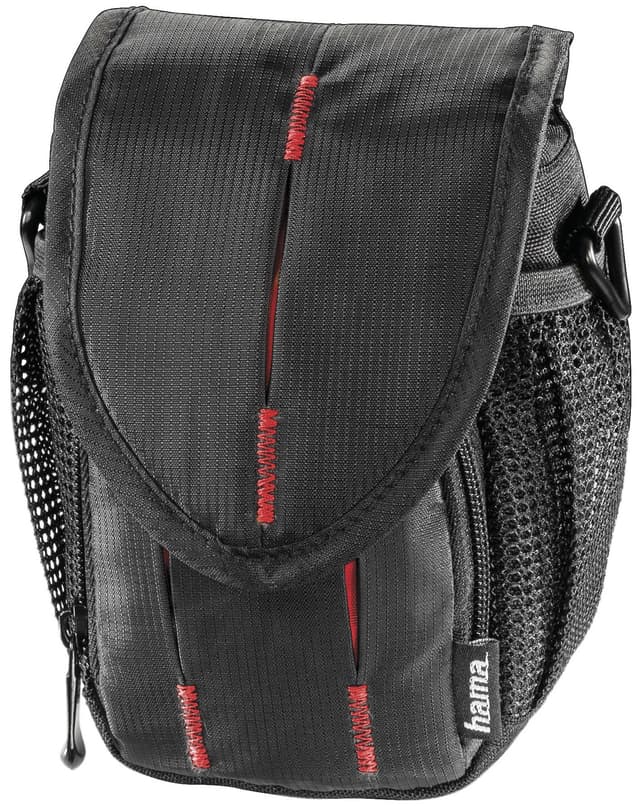Musta kameralaukku punaisilla yksityiskohdilla. Hama Canberra 90 on digikameroille sopiva laukku.