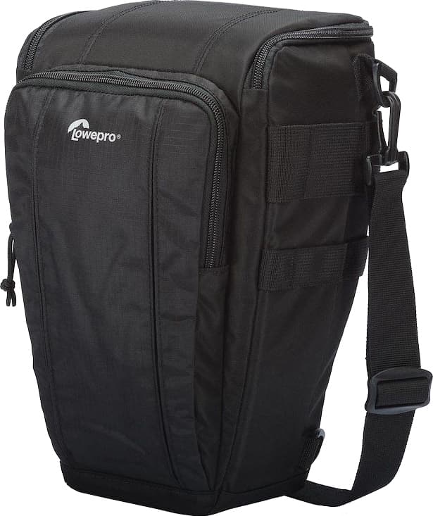 Lowepro Toploader Zoom 55 AW II -kameralaukkuun mahtuu DSLR-kamera jopa 70-200 mm kokoisella objektiivilla. Kameralaukku suojaa kameraa kattavasti sateelta, lumelta ja pölyltä. Ylhäältä avattavaa laukkua voi pitää sivuttain olkalaukkumaisesti tai rintakehää vasten.