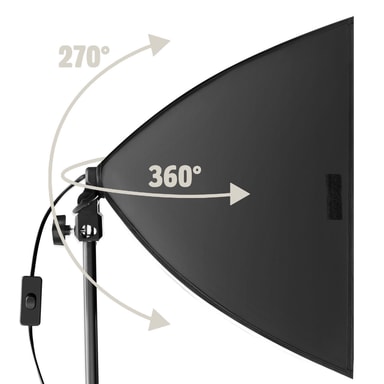 Tekniset tiedot • Polttimo 18 W, 6500 K (jatkuva valo) • Jalusta, joka voidaan pidentää n. 70 cm:stä max. 215 cm:iin • Pehmeä laatikko: n. 68 x 50 cm • Kaapelin pituus: n. 2,30 m • Kantolaukku: n. 75 x 18 x 12 cm • Paino: n. 2,2 kg • Materiaali: metallia