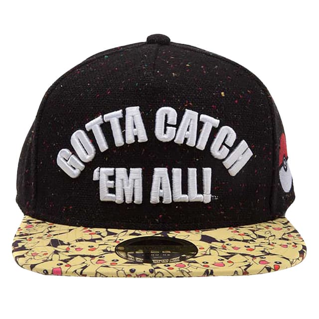 Sininen Pokémon-lippalakki, jossa edessä Gotta catch 'Em All -teksti ja lipassa Pikachun kuvia. 70 % polyesteria, 28 % puuvillaa, 2 % lycraa, universaali koko.