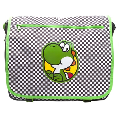 Ruudulliseen Nintendo Yoshi -olkalaukkuun mahtuu kannettava tietokone ja päivittäiset tavarat. Laukussa on useita vetoketjulla suljettavia taskuja ja säädettävä olkahihna.