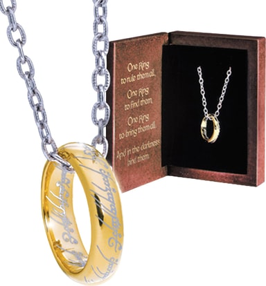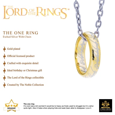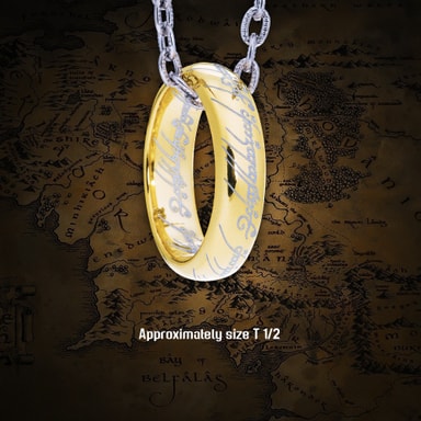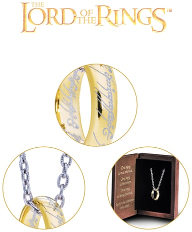 Noble Collection Lord of The Rings -valtasormus on virallisesti lisensoitu jäljennös, joka on päällystetty puhtaalla kullalla ja siinä on laserkaiverrettu haltiakieli sisä- ja ulkopuolella. Mukana tulee 24 tuuman ruostumattomasta teräksestä valmistettu ketju ja puinen keräilijän laatikko.