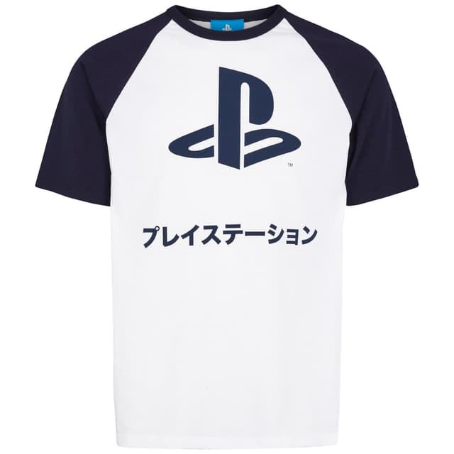 Valkoisen ja sinisen värinen t-paita japanilaisella PlayStation -logolla. 100-prosenttista puuvillaa, koko L, vastaa eurooppalaista kokoa 52.
