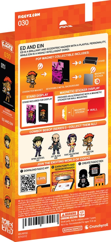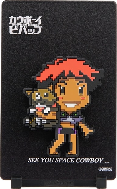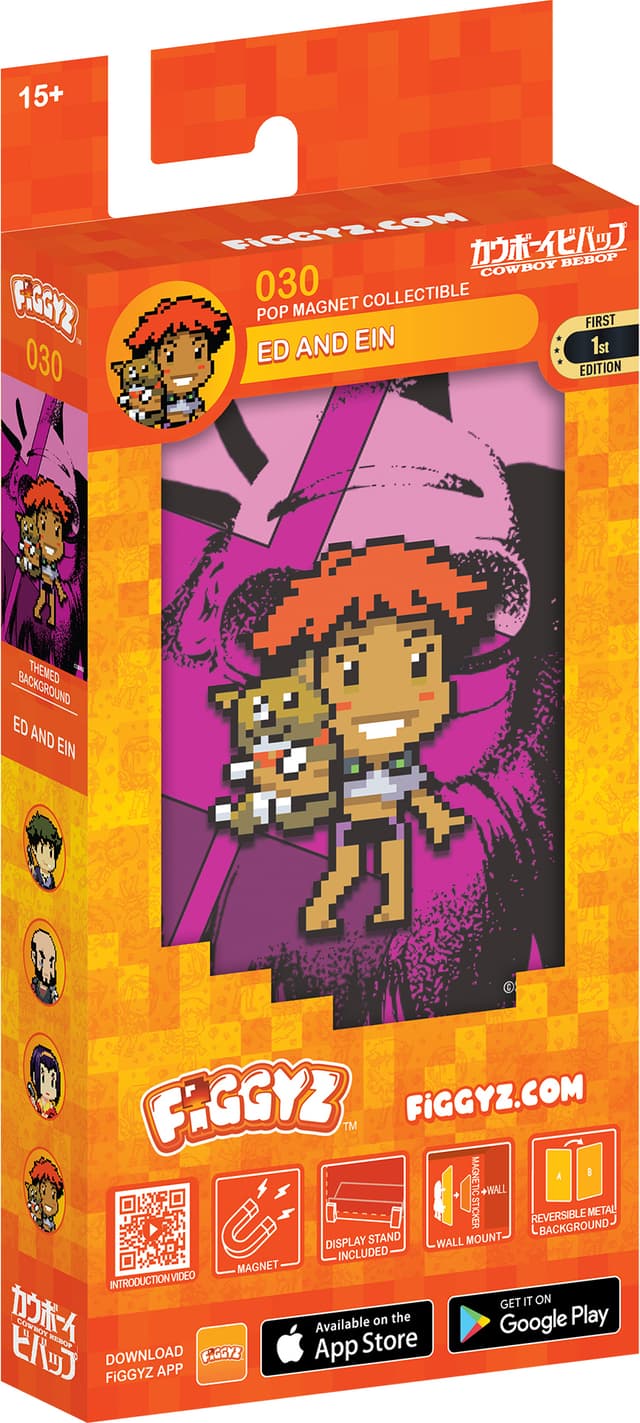 First 4 Figures FiGGYZ Cowboy Bebop -hahmomagneetti sisältää käännettävän metallisen takalevyn, joka tarjoaa kaksi esillepanovaihtoehtoa, pikselitaidetyylisen hahmon, 3D-pop-out-efektin, esillepanopohjan ja magneettisen tarran.