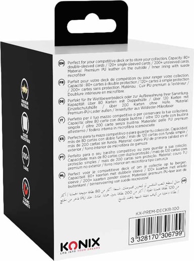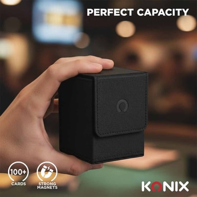 Konix TCG PU Premium -pakkakoteloon mahtuu yli 100 korttia ja se sopii suosittuihin korttipeleihin kuten Pokémon, Lorcana ja Magic. Tukeva rakenne ja magneettisulkija pitävät korttisi turvassa ja helposti saatavilla missä tahansa pelaatkin.